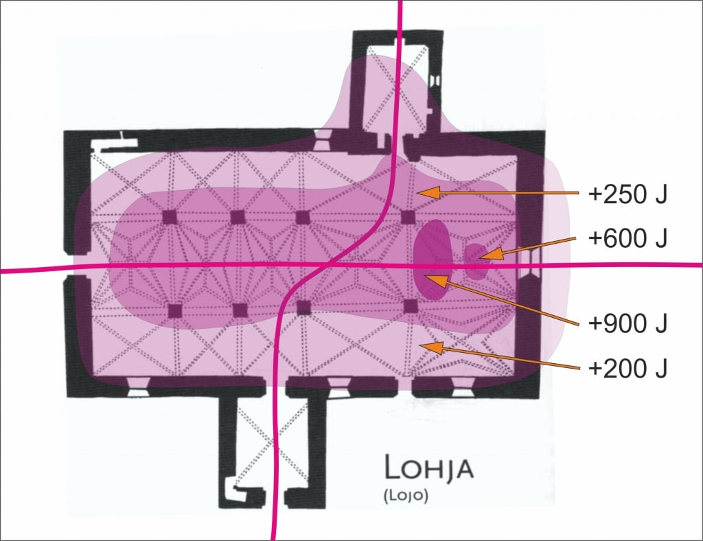 Lohjan kirkossa on erittäin hyvä ilmapiiri eli siellä on ns. hyvät värähtelyt. Kirkon sisällä olevien alueiden hyvyyttä on kuvattu eri väreillä. Kuvaan on myös merkitty kirkon kautta kulkevat ns. kirkkolinjat. Yleensä keskiaikaisten suomalaisten kivikirkkojen kautta kulkee vähintään yksi kirkkolinja, joka jostain syystä kulkee kirkon pituussuunnassa ja tulee ulos alttariseinän keskeltä.