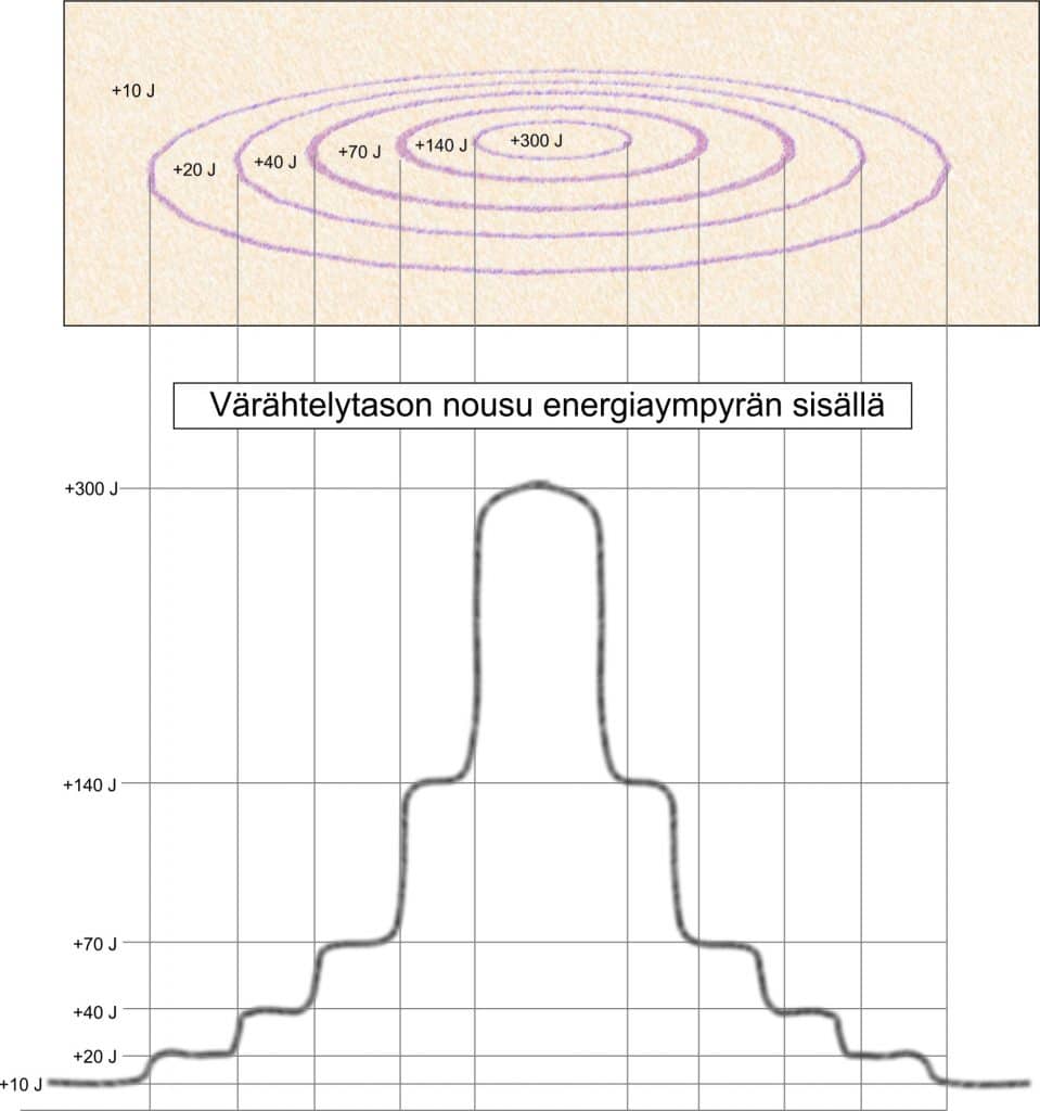 Muutaman sadan metrin välein on voimakkuuksiltaan erilaisia ja muodoltaan pyöreitä energiapaikkoja. Näiden paikkojen halkaisja vaihtelee noin metristä kymmeniin metreihin. Värähtelytaso näissä ympyröissä kasvaa portaittain keskipistettä kohti. Ympyrän keskellä on korkein värähtelytaso. Sisäkkäisiä ympyrätasoja voi olla muutamasta jopa kahteen kymmeneen.