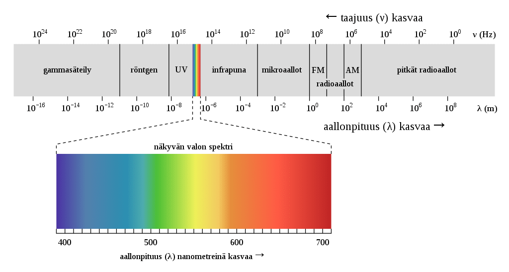Sähkömagneettinen spektri muodostuu vaihtuvasta sähkö- ja magneettikentästä. Nämä etenevät avaruudessa yleensä suoraa reittiä ja niiden värähtelytasot ovat toisiinsa nähden 90 asteen kulmassa. Sähkömagneettinen spektri on jaettu eri alueisiin joko käyttötarkoituksen tai vaikutusominaisuuksien mukaan. Silmin nähtävä taajuusspektrin alue on varsin kapea osa tästä eli vain noin 380 nm – 780 nm.