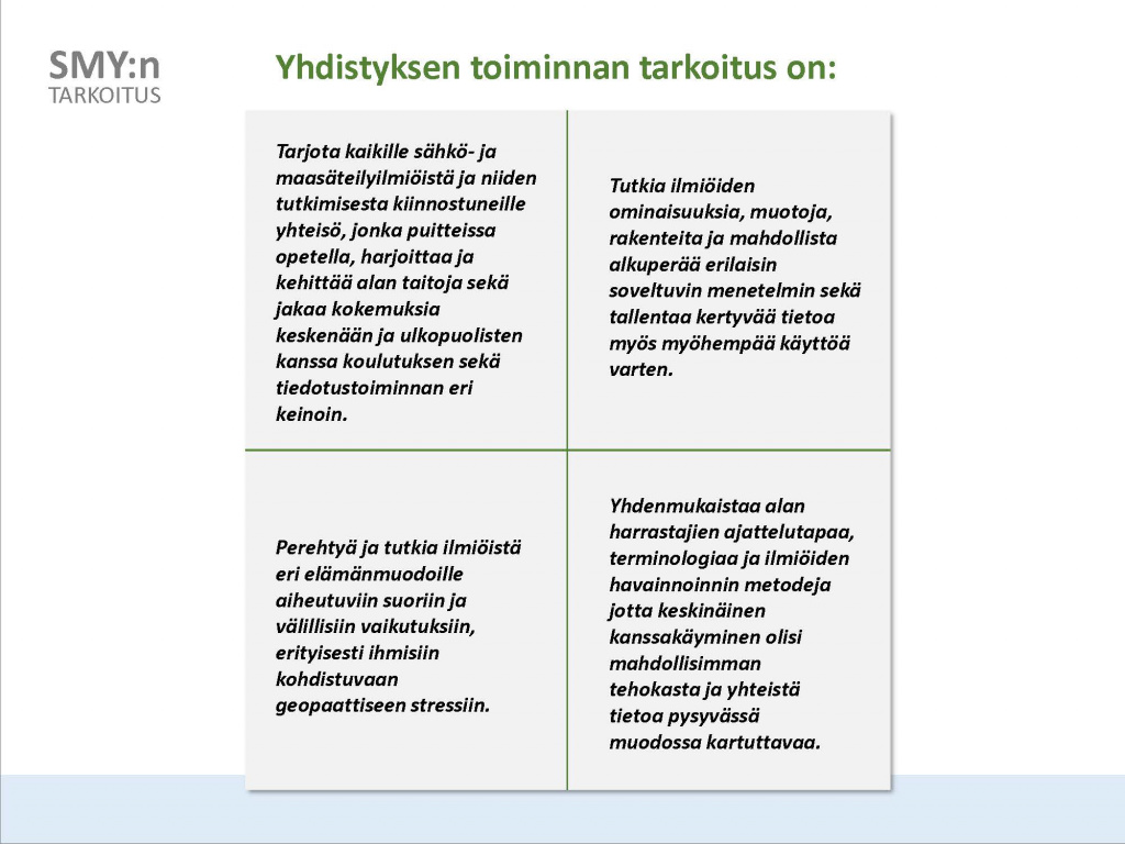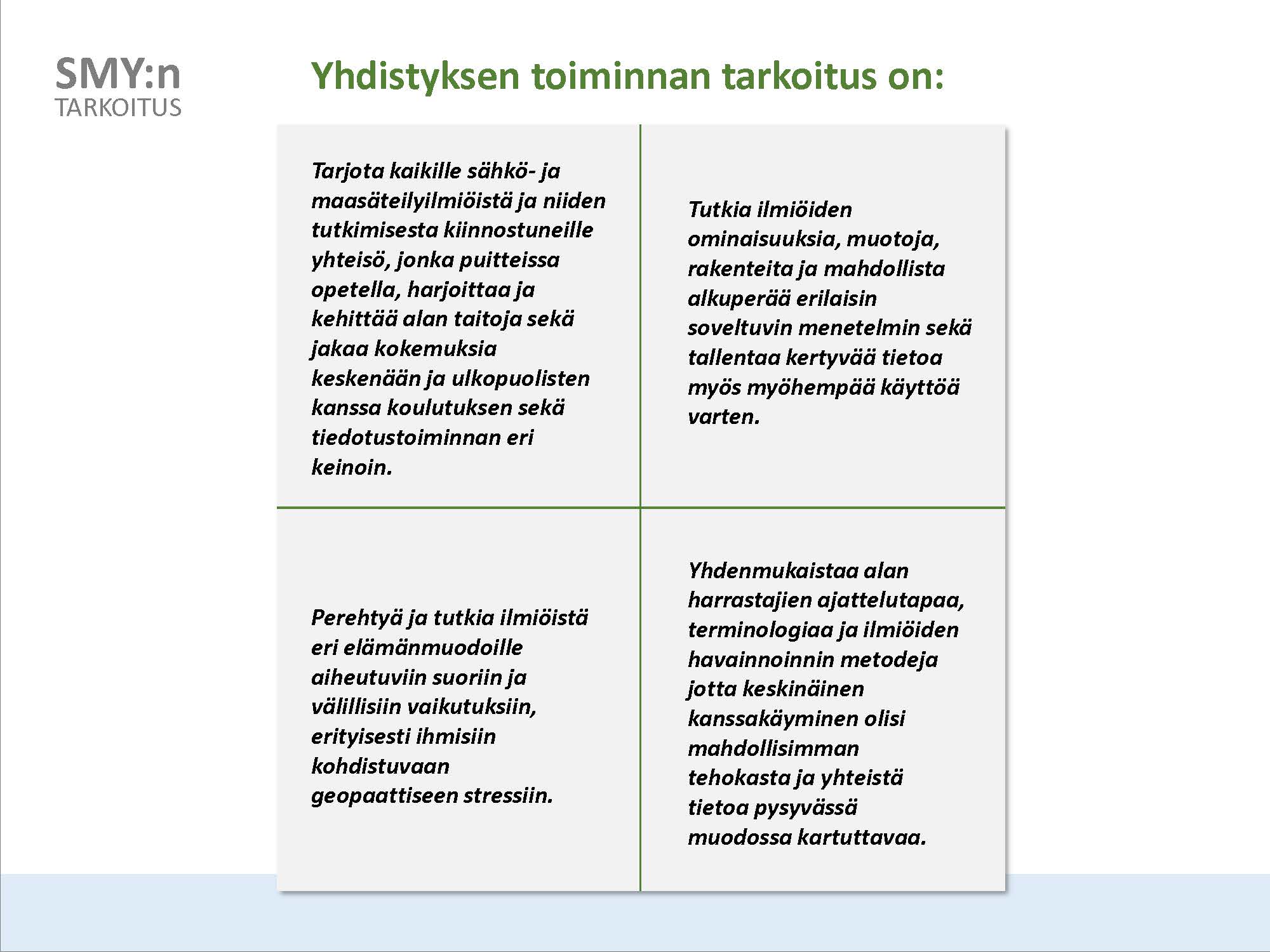 Yhdistyksen tarkoituksena on harjoittaa ja edistää maasäteilyksi kutsuttujen ilmiöiden tutkimusta Suomessa, kehittää sen harrastuksen tasoa ja koota alan harrastajat mukaan yhteiseen toimintaan.